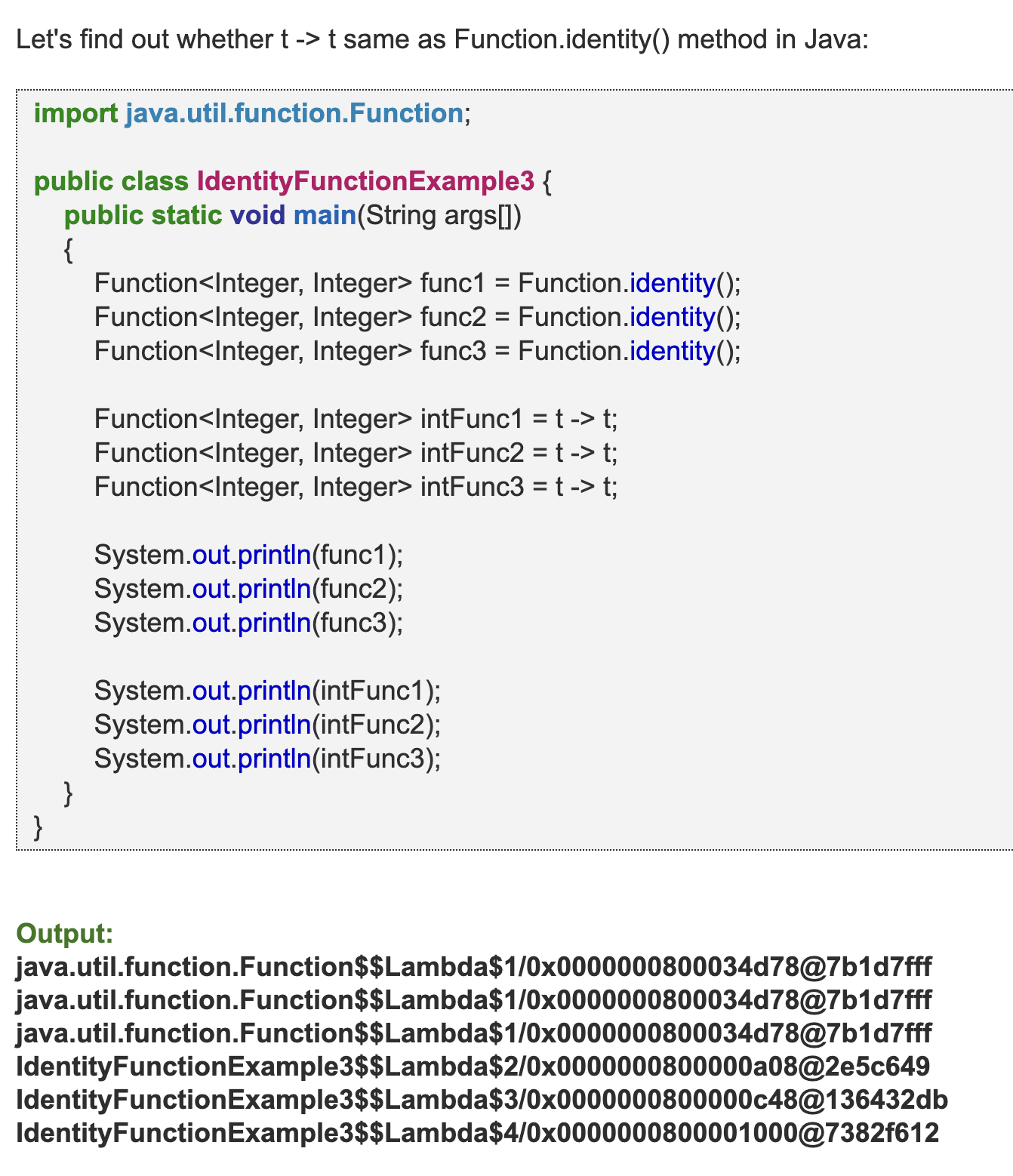 Function.identity()을 사용하는 것은 항상 같은 instance를 넘기지만 identifier -> identifier 를 사용하는 것은 인스턴스를 새로 생성할 뿐 아니라 별개의 implementation class를 가진다.