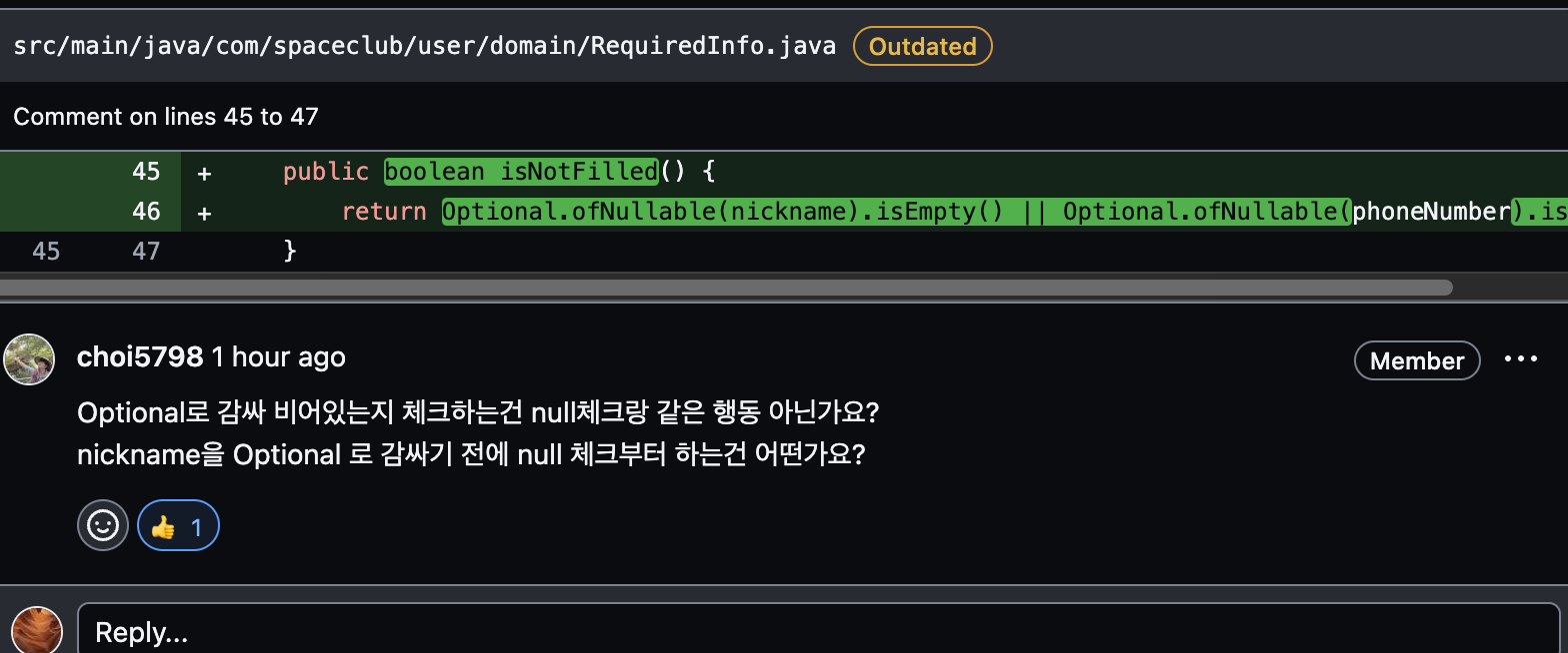 또한 null check에 있어서 Optional 클래스 안에 isEmpty()와 같은 메서드를 통해 가독성을 증가 시킬 수 있다고 생각해 사용했다.