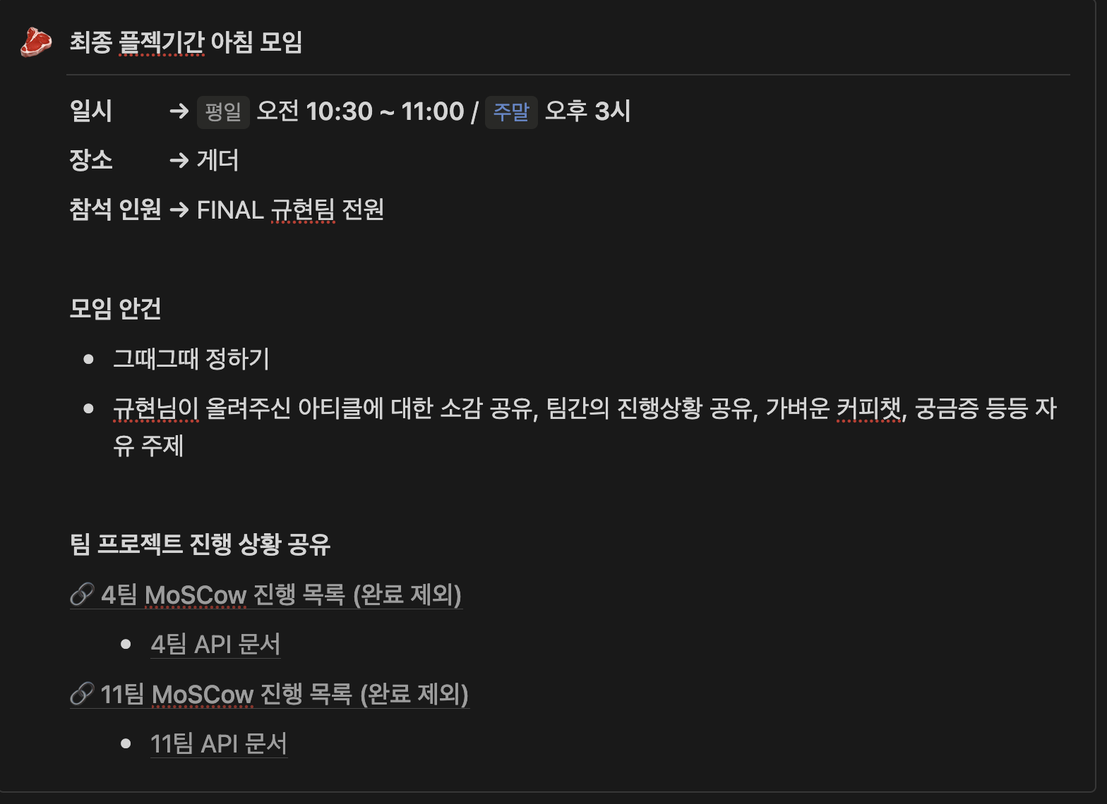 아침 늦잠 방지를 위해서, 그리고 다른 프로젝트를 진행하는 팀원들의 기술을 엿보기 위해서 멘토님이 아침에 다른 팀과 진행사항 공유하는 시간을 가지라고 했는데, 다른 팀의 문제를 함께 해결하고, 내가 진행하는 개발에 대한 고민들을 공유하면서 기술적으로 많은 고민을 하는 시간이기도 했다. (제대로 진행안해서 멘토님한테 많은 혼이 났기도 했는데, 지금 생각해보면 그것조차 그립고 추억인것 같다)
