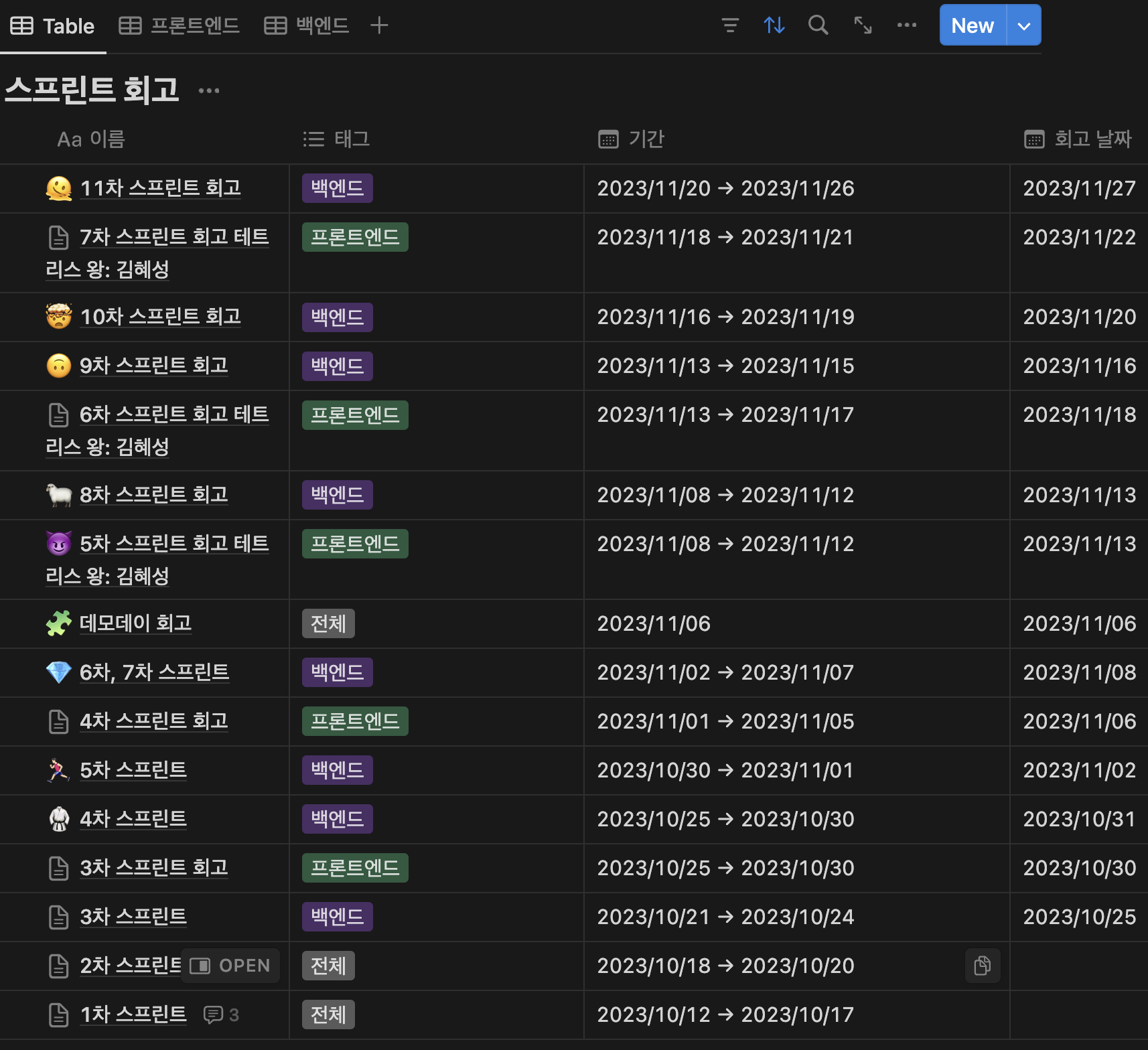 총 11차례의 스프린트를 거치며 회고를 진행하기도 했다.