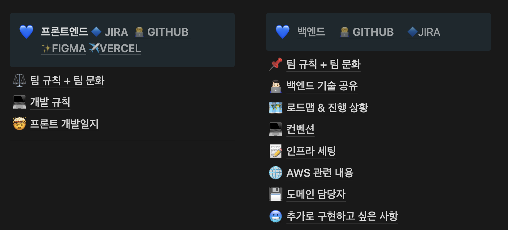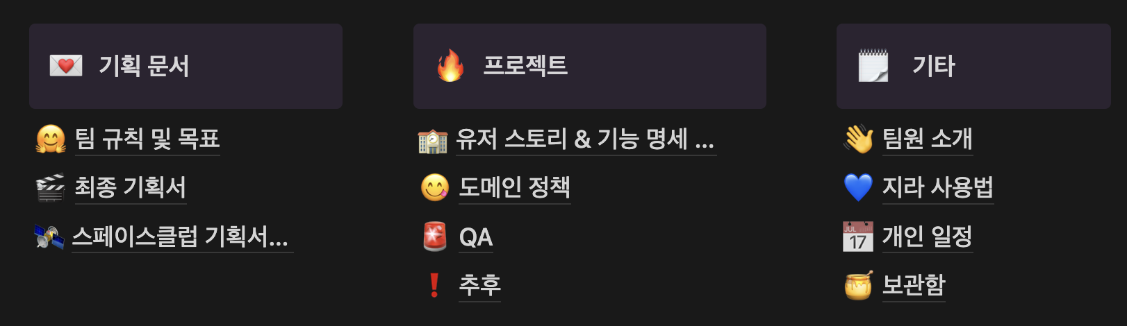 기획서부터, 개인일정 관리까지 비동기적으로 소통할 수 있는것을 최대한 지향했기 때문에, 기획서부터 개인 일정까지 모든 내용들을 투명하게 공유했다.