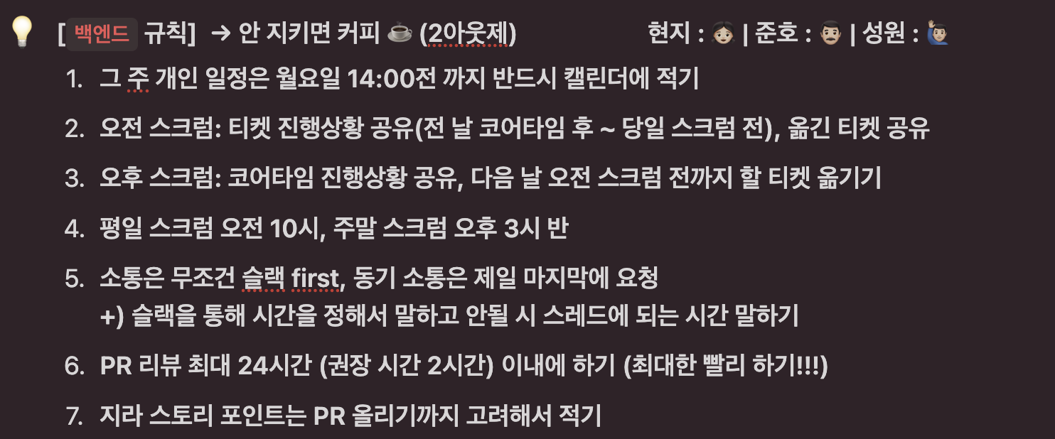 위와 같이 매 스프린트때 마다 팀 규칙을 세워 진행해 나가기도 했고,