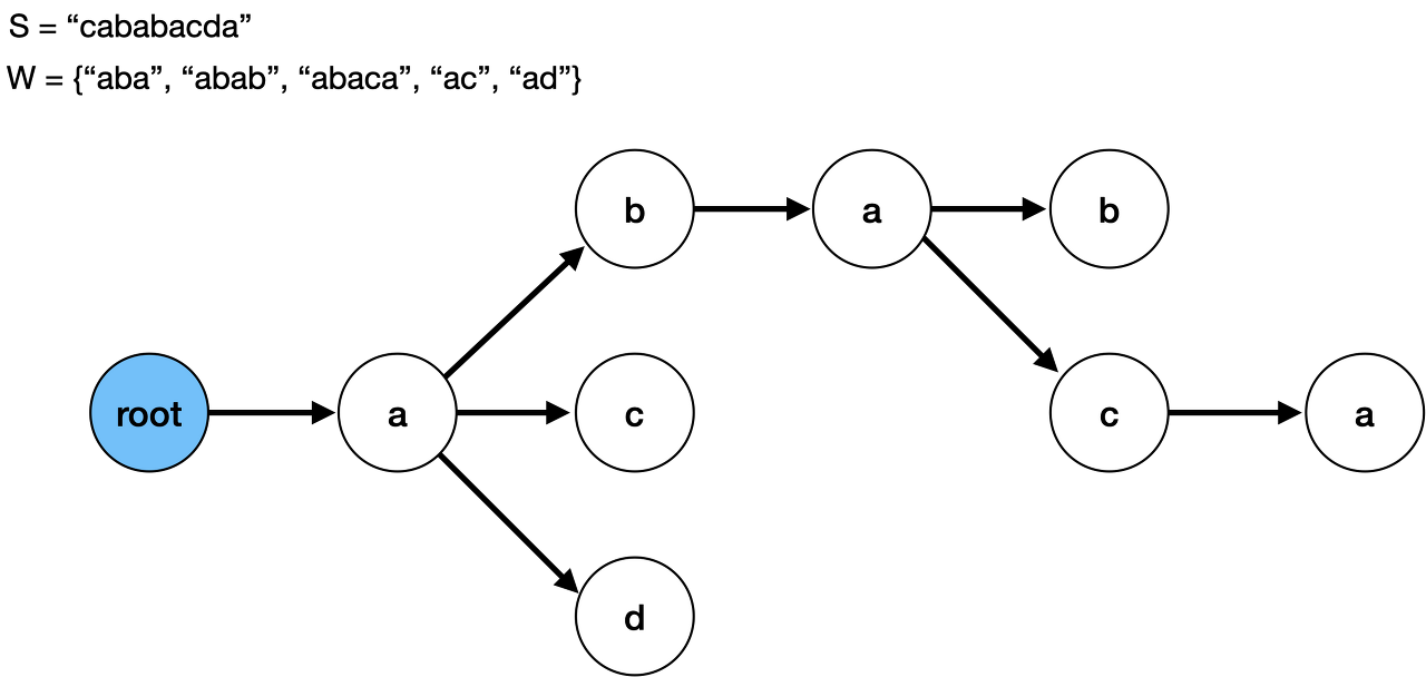 ๊ฐ ๋ ธ๋๋ ๋ฌธ์ ํ๋์ ๋ฌธ์์ด ์์ฑ ์ฌ๋ถ๋ฅผ ๋ํ๋ด๋ฉฐ, ํธ๋ผ์ด๋ฅผ ์ด๋ค ๊ฒฝ๋ก๋ก ํ๊ณ ๋ด๋ ค๊ฐ๋์ง์ ๋ฐ๋ผ ๋ฌธ์์ด์ด ์กฐํฉ๋๋ค.