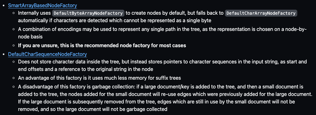 ์๋ ๊ณต์๋ฌธ์์ ๋ฐ๋ฅด๋ฉด, DefaultCharSequenceNodeFactory๋ suffix tree ์ฌ์ฉ์ ๋ฉ๋ชจ๋ฆฌ ํจ์จ์ ๋ํ ์ค ์ ์๋ค๊ณ ํ๋ค.