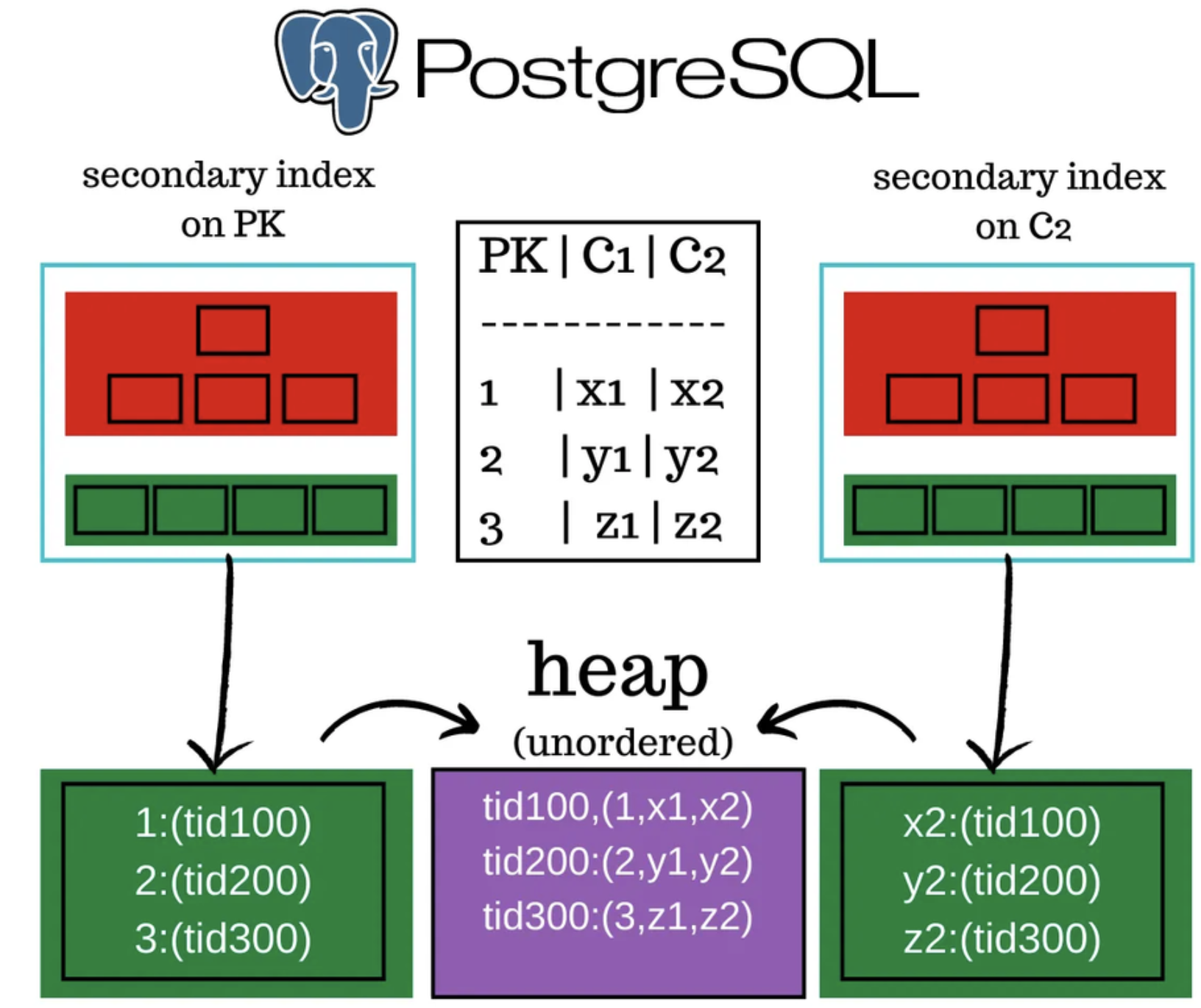 또한, 모든 인덱스는 세컨더리 인덱스입니다. 또한 모든 인덱스는 heap 영역에 로드 된 데이터 페이지에 있는 tuple ID를 가리킵니다.