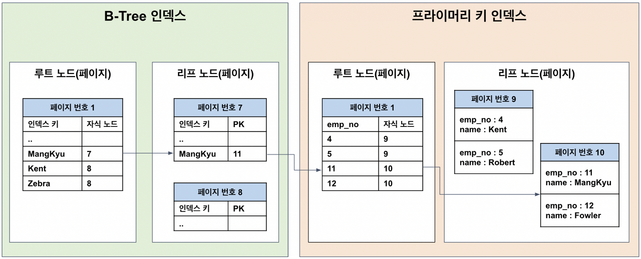 세컨더리 인덱스 B-Tree 구조의 leaf 노드에는 pk를 가지게 되고 pk로 primary index를 추가적으로 조회하여 디스크의 페이지에 접근하게 됩니다.