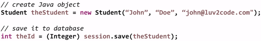 다음 게시글에서 다루겠지만, session이라는 특별한 hibernate 객체를 이용해서 sessionl.save(객체)를 통해 객체를 넘겨준다. 그러면 백그라운드에서 hibernate가 그 java object를 이미 정의한 mapping에 근거하여(Student객체에 설정, 다음 게시물에서 다룸) 그 정보를 가지고 적절한 테이블과 column에 저장한다. 모든것을 hibernate가 대신 해주는 것이다.