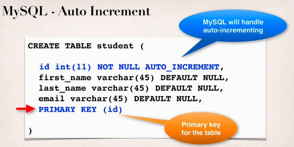 예) ALTER TABLE hb_student_tracker .student AUTO_INCREMENT=3000 를 통해 3001부터 id값이 추가되게 된다.