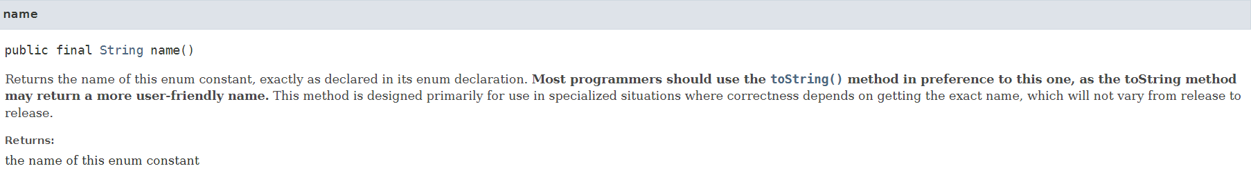 java.lang.Enum 클래스를 모두 enum은 상속받고 있으므로, Enum이 제공하는 메소드 중 name()은 enum상수의 이름을 리턴한다. 하지만 오라클에서 대부분의 프로그래머들은 이 메소드 보다 toString() 메소드를 사용해야 한다고 한다. 왜냐하면 toString()메소드가 유저-친화적인 이름을 반환할수 있기 때문이라고 적혀있다. name()은 final로 정의되어 override가 불가능하지만, toString()으로 override가 가능하기 때문인것으로 보인다.
