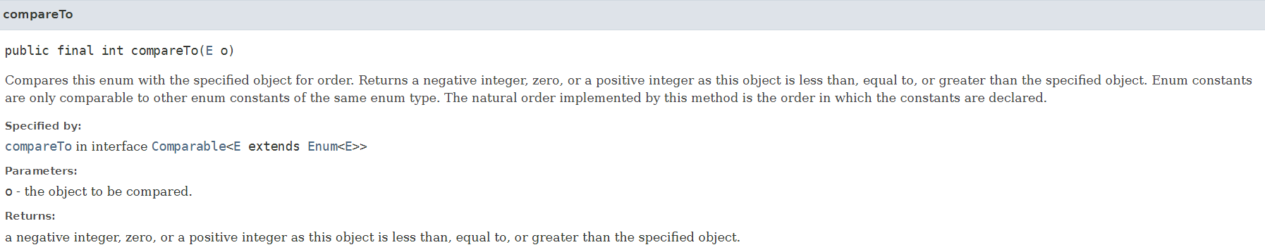 compareTo()의 매개변수로는 Enum만 받을 수 있으며, 명시된 enum사이의 순서를 비교해 integer값인 양수, 음수, 0을 반환한다. 반드시 같은 종류의 enum 타입간의 enum 상수 비교만이 가능하다.