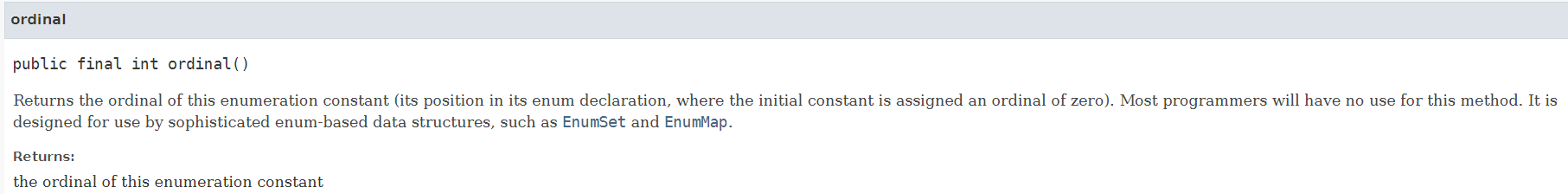 enumeration 상수의 인덱스 번호. 순서를 반환한다. 처음 정의되어 있는 상수를 0을 시작으로 int값을 반환한다. 하지만 대부분의 프로그래머들은 이 메소드를 사용할 일이 없으며 이에 의존해 코딩하는것은 enum에 정의된 상수의 순서가 바뀌는 순간 깨지기 때문에 사용하지 않는 것이 좋다. EnumSet과 EnumMap과 같은 enum기반의 자료구조를 디자인하는데 사용되는 메소드이다.