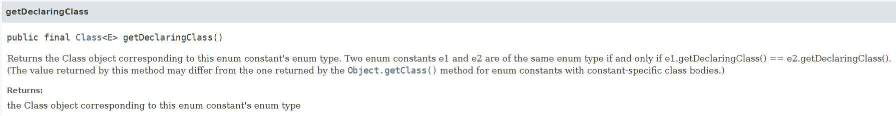 enum상수의 enum 타입에 상응하는 클래스 객체를 반환한다. 그래서 어느 enum에 속한 상수인지 알 수 있다.