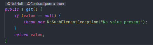 - .get() : Optional객체에 저장되어 있는 value를 가져온다. 비어있는 Optional 개체에 대해서 NoSuchElementException을 던진다.