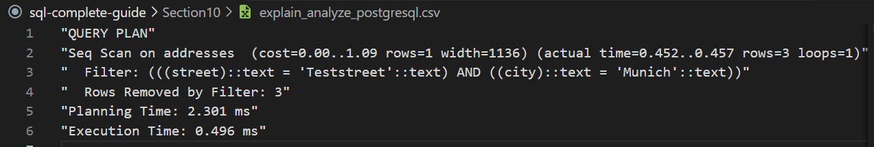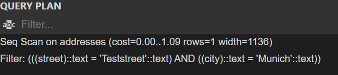 "-> Filter: ((addresses.city = 'Munich') and (addresses.street = 'Teststreet')) (cost=0.85 rows=1) (actual time=0.048..0.058 rows=3 loops=1) -> Table scan on addresses (cost=0.85 rows=6) (actual time=0.041..0.048 rows=6 loops=1) " |