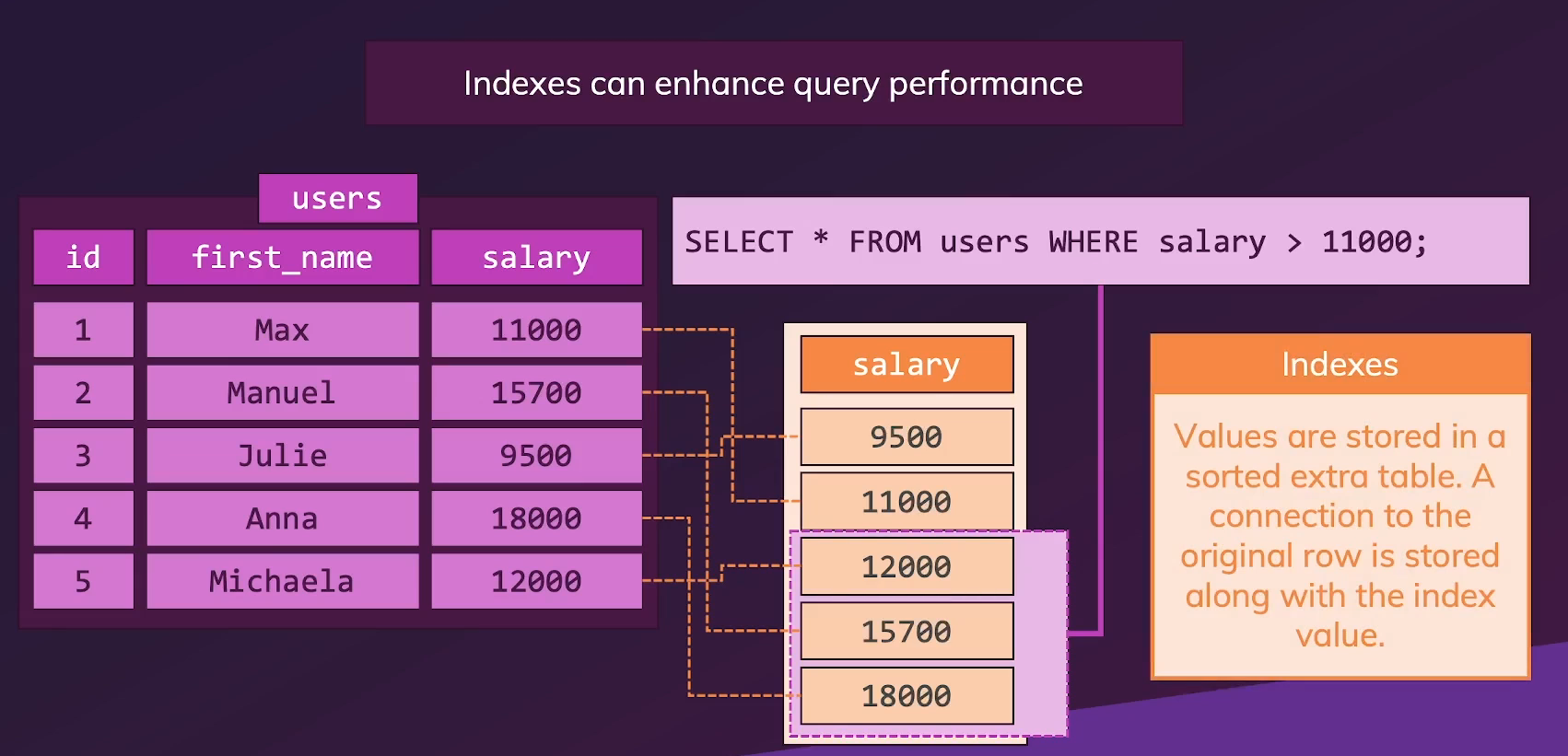 table의 어떠한 column에도 index를 생성 할 수 있고, 위의 그림에서는 salary column에 대해서 별도의 index 테이블로 저장하여 추가적인 index list를 정렬된 기준으로 만들어, DBMS가 쿼리시 실제 테이블의 어떤 row가 index값에 속하는지를 추적하는 것이다. index는 정렬되어 있기 때문에, 쿼리를 실행하면 DBMS가 users 테이블로 바로 가는 것이 아닌, salary index를 보고 DBMS가 조건에 맞는 것을 찾아 특정 부분만 검색하는 것이다.