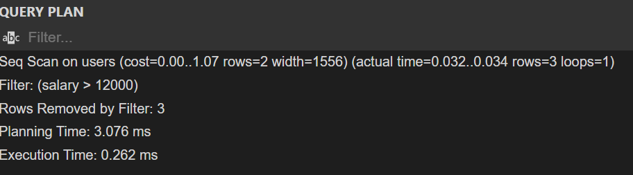 "-> Index range scan on users using salaryidx, with index condition: (users.salary > 12000) (cost=1.61 rows=3) (actual time=0.036..0.039 rows=3 loops=1)