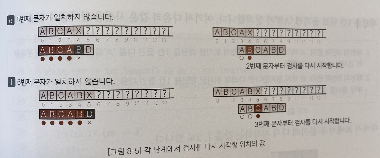 text와 pattern의 일치하지 않는곳 까지 한 문자씩 비교를 했을때, 검사를 마친 문자열에서, pi[i]값이 0이라면, pattern의1번째 문자부터 일치하지 않는곳으로 뛰어넘어 다시 검사를 하고,