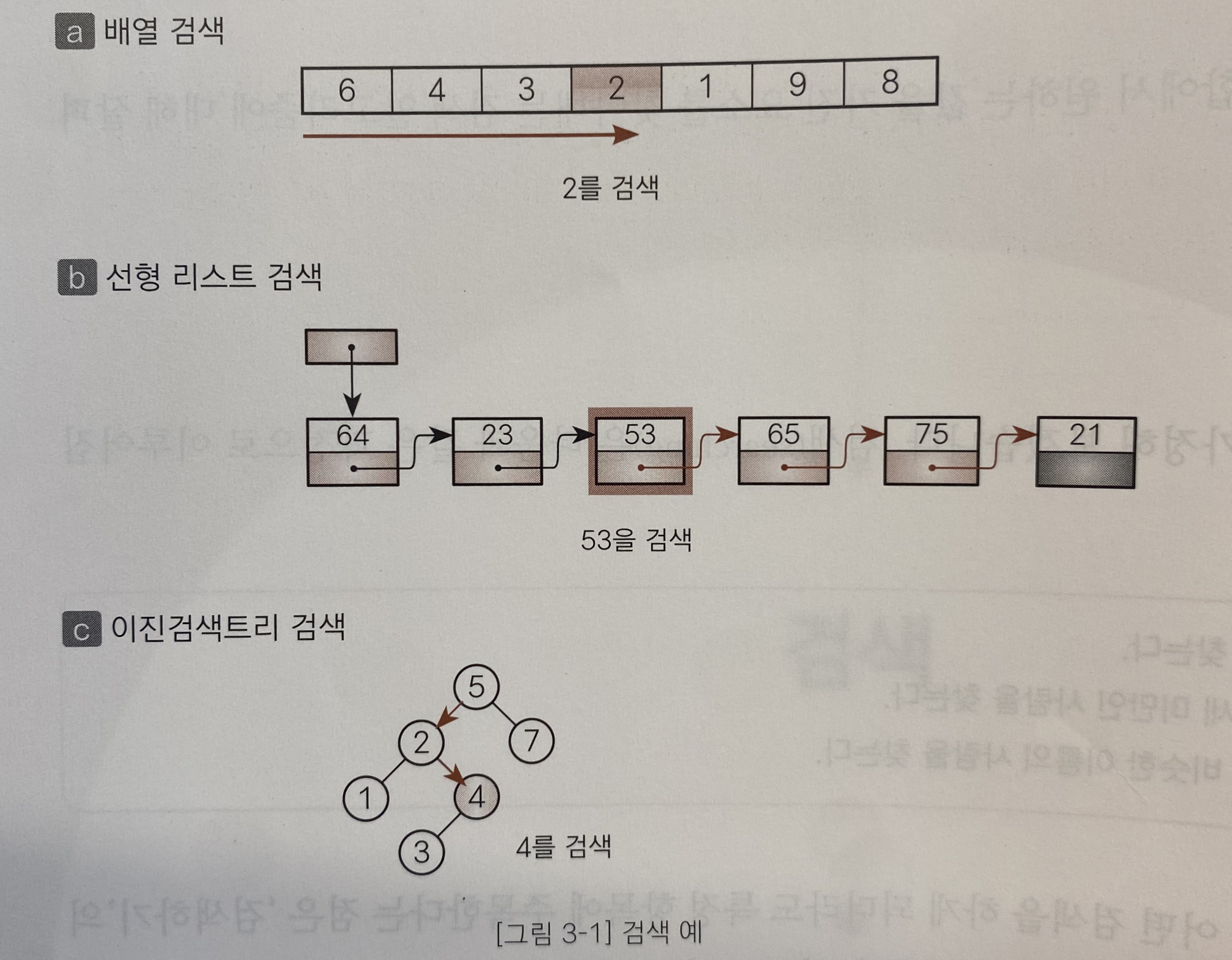 요소가 직선 모양으로 늘어선 배열에서의 검색은 원하는 키 값을 갖는 요소를 만날때 까지 맨 앞부터 순서대로 요소를 검색한다. (기본적으로 n(배열길이) for문 돌면서 키 값 요소와 비교 하는 방법)