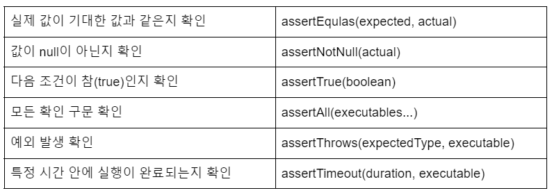 테스트는 setup -> execute -> assert 과정으로 진행 되는데, setup 단계에서는 instance를 생성하고, execute 단계에서는 테스트할 메서드를 호출하고, assert 단계에서는 기대값과 실제 값을 비교해 검증한다.