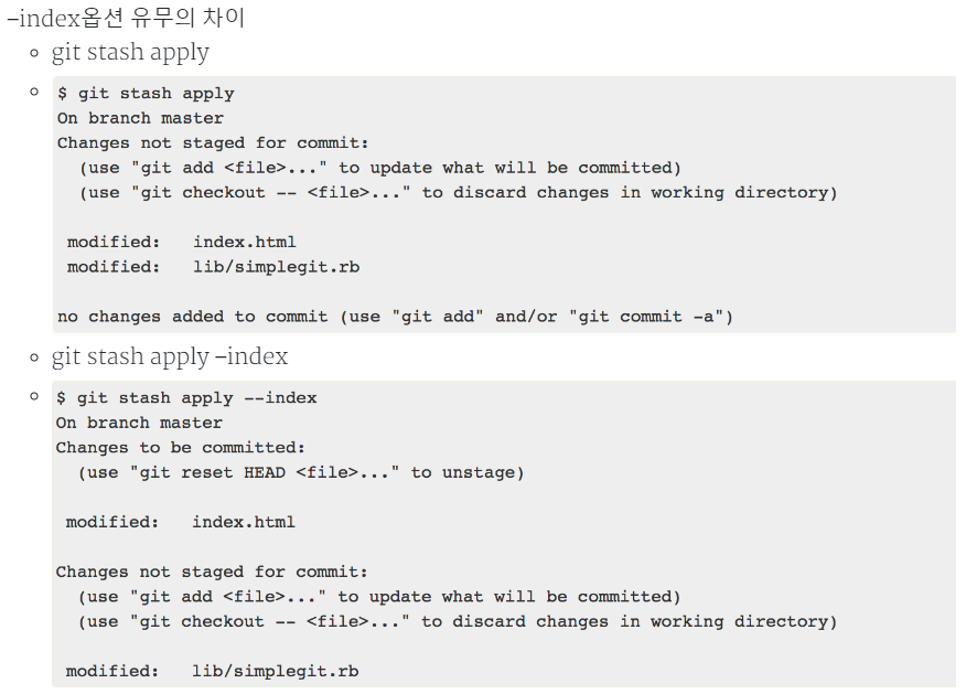 반면, git stash apply는 stash list에 나중 재사용 가능성을 위해서 남긴다. (git stash drop 할 수 있다.)